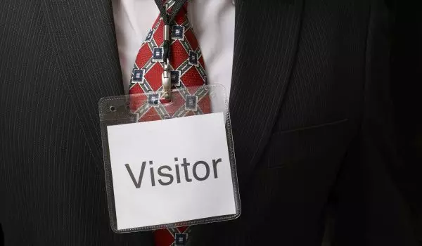 An individual wearing a suit and tie with a Visitor badge on a lanyard around their neck