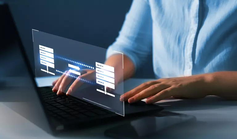 An individual typing on a laptop with a hologrpahic display above the keyboard